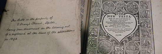 There is, however, a bible which was found in a cupboard in 1892, this appears to have been made up of parts of older bibles, and the new testament within this volume has the imprint of Christopher Barker dated 1599, so it is possible that this is part of the Bold Bible.