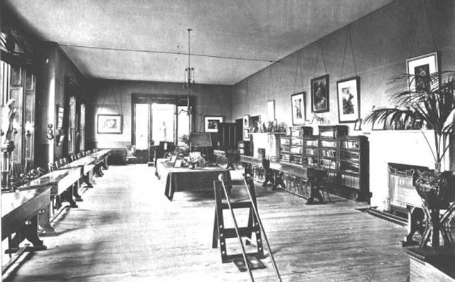 The room is 60 feet long by 28 feet wide and was originally heated by two coal fires in large marble chimney pieces. Lighting was by means of five gas chandeliers.