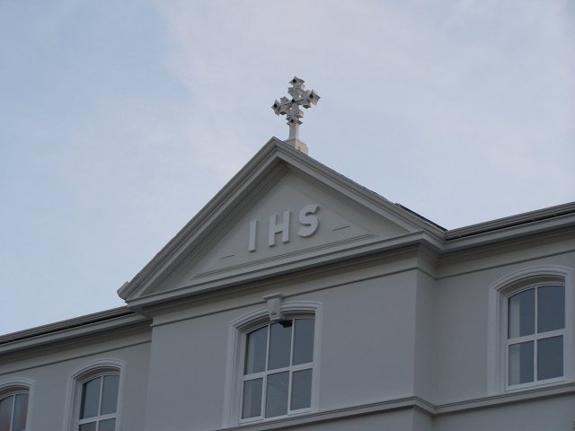 The building is designed in the Italian style. A cross is mounted on the apex of the roof, this is five feet tall and is inlaid with copper gilt bands and Bohemian prismatic glass. Below the cross are the letters I H S, these were originally painted white, edged with vermilion. The background was painted ultramarine. People often ask what I H S means.