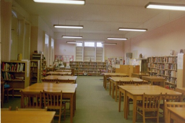 The room became the School Library, with little change in its appearance. In 1977 the Library was re-organised, the old bookcases were removed and sold at auction (the bookcases sold for £900), and new bookcases were installed. At the same time a sliding acoustic screen was fitted to enable one third of the library to be used as a classroom. This did not proove successful and the small area (room 17) was used as the sixth form study for a period. Later, the whole room was used for the Library once again. The screen was removed in 1999.